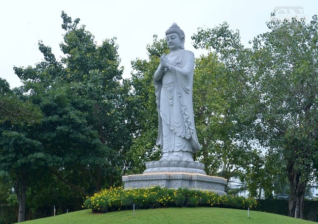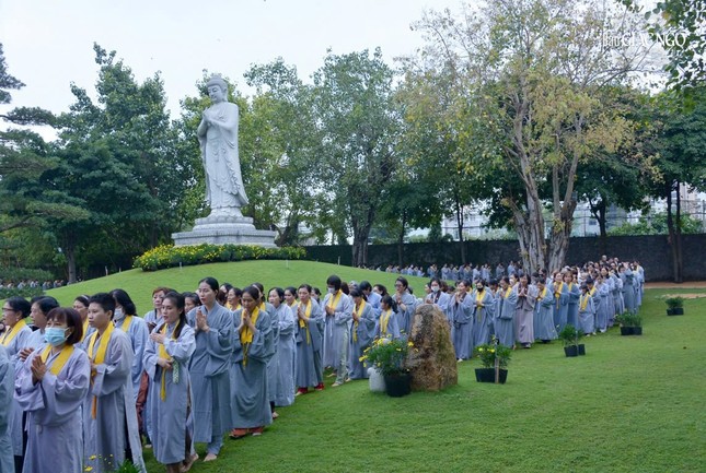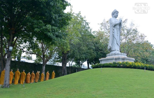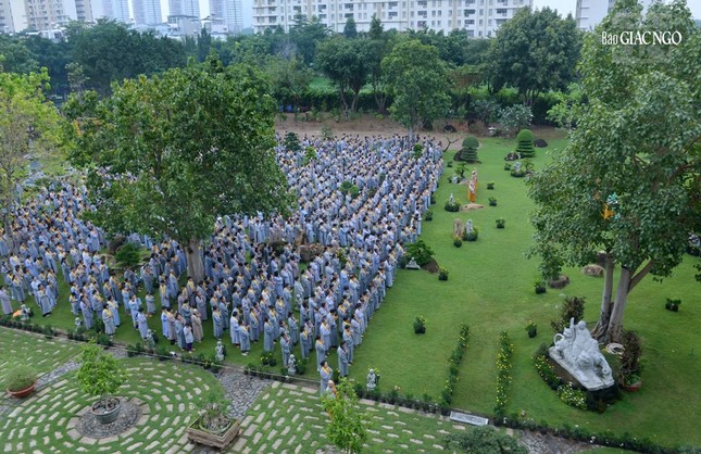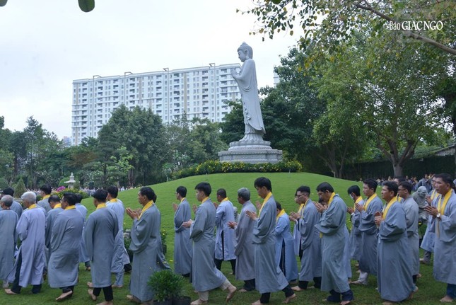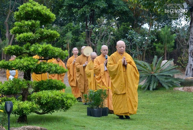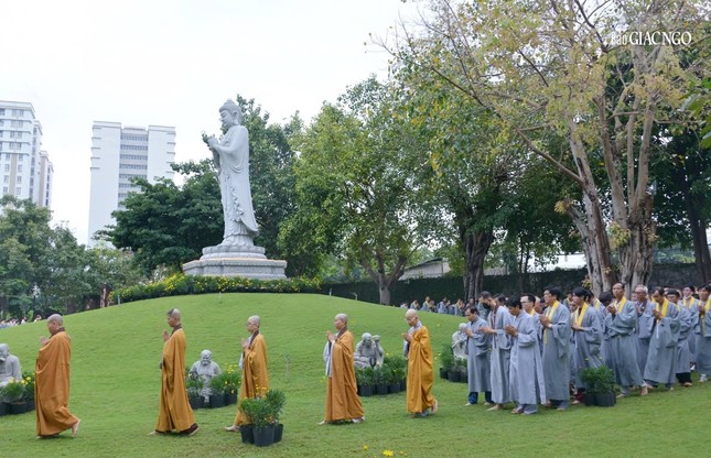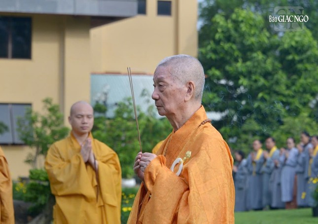 Vào lúc 6 giờ sáng, chư tôn đức đã cử hành nghi thức Lễ vía Đức Phật A Di Đà, đồng tụng kinh văn và chánh niệm kinh hành niệm Phật trong vườn Di Đà thuộc khuôn viên chùa Huê Nghiêm.
